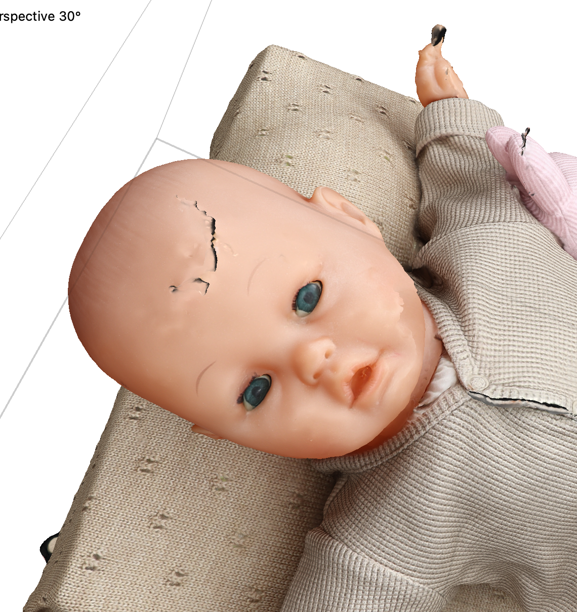 The process of this 3D model had its challenges, but offered many opportunities for learning and gaining new skills. The 3D model creation process is divided into preparation, material creation, and Metashape processing. First, the preparation steps included applying baby powder and matt spray to reduce reflections, ensuring stability for 360-degree capturing, and creating a baby crib setup. The set up for the photos was another crucial part, as the Baby Doll needed stability that would enable us to capture it clearly from an 360 degree angle. It could not stand or sit on its own, therefore we created a baby crib by ourselves. We learnt that each toy is individual, and needs different solutions. We also challenged our creativitiy by creating a setup.