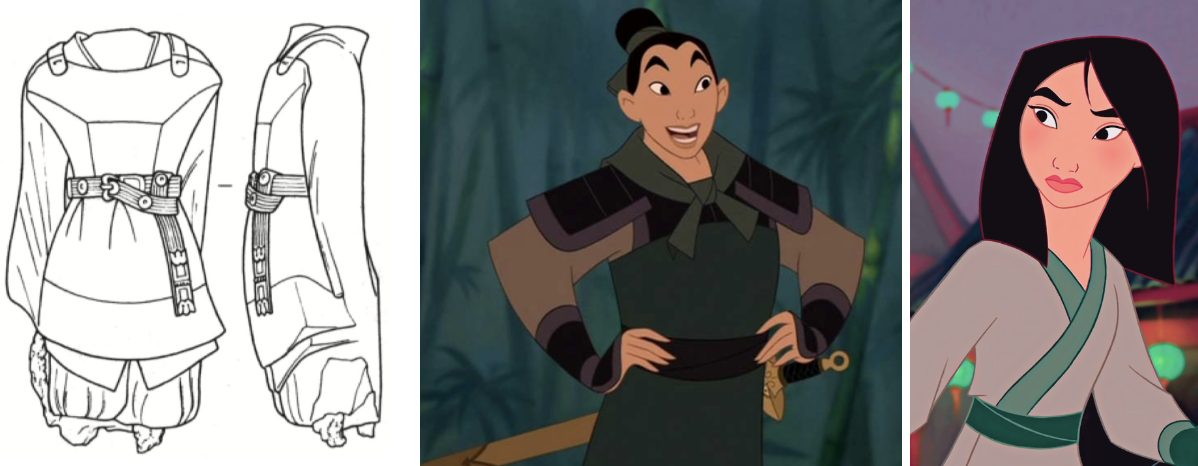 Different traditional clothing has been shown in the majority of Mulan presentations according to the original ballad, Mulan's unique clothing and makeup could reflect how young women and warriors dressed during the Northern Wei era. Disney’s movies demonstrate Mulan’s everyday look in public and the typical makeup with more femininity, while her outfit becomes more manlike after she joined the army.