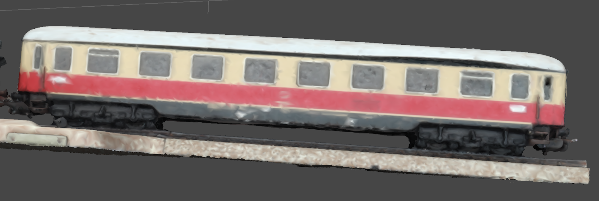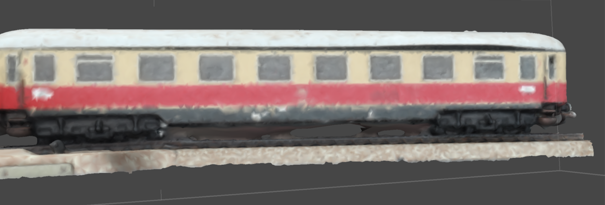 While capturing the object (in this case – a model train), we followed rules of SfM capturing. To allow a undisrupted processing by the software, the toy was put on a turntable inside a light box (as shown in picture 1). We surrounded the object with scale bars to support the accurate measurements and position of the 3D model. We took the photos from three different angles (top, middle, bottom) and turned the turntable before each photo. Ideally, adjacent photos should overlap 60%. However, the movement between pictures was too small and resulted in a heavy dataset, which led to the program running at a slow speed. Therefore, in the end, only every fourth photo was used, enabling reaching the desired overlap percentage and smooth processing. The imported dataset was a large set of photographs of the object, which was later aligned. Following this step, a point cloud was created and then cleaned of extraneous data. After the point cloud did not contain any parts of the background, we built the model. The result was satisfactory – the train constituted the only part of the model. However, after building texture, generating masks from selected photos was necessary (see picture 2).