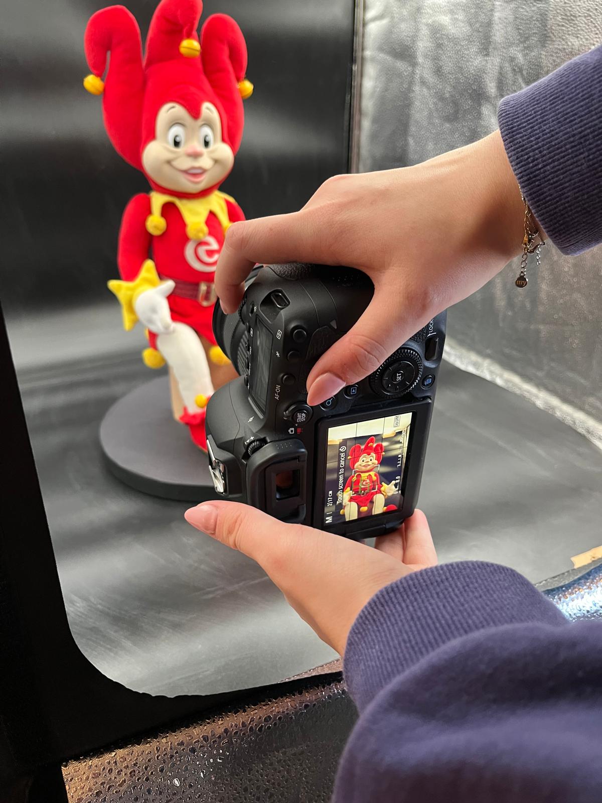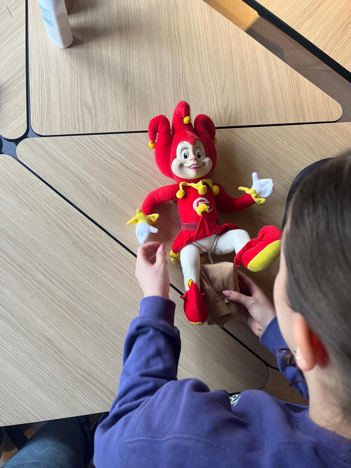 It was necessary to hide the wire to maintain visual integrity. We wrapped the wire in red insulation tape on the body and white tape on the legs to match the costume. We also carefully pinned certain moving parts of the costume and opened the skirt slightly to reveal the tag. The tag itself was secured with double-sided tape so that it could be removed easily.