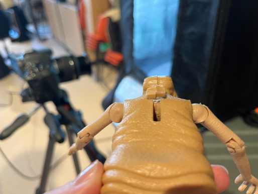 To capture E.T. properly for the 3D model, we had to make sure his limbs didn’t move as we rotated him around to capture all the angles. His arms were quite stiff and stayed in place during the process. His head, on the other hand, was extendable and, because the toy is quite old, this part was quite loose. We used small pieces of sticky clay to stabilise his head. This worked well, although the clay is visible in the final model.