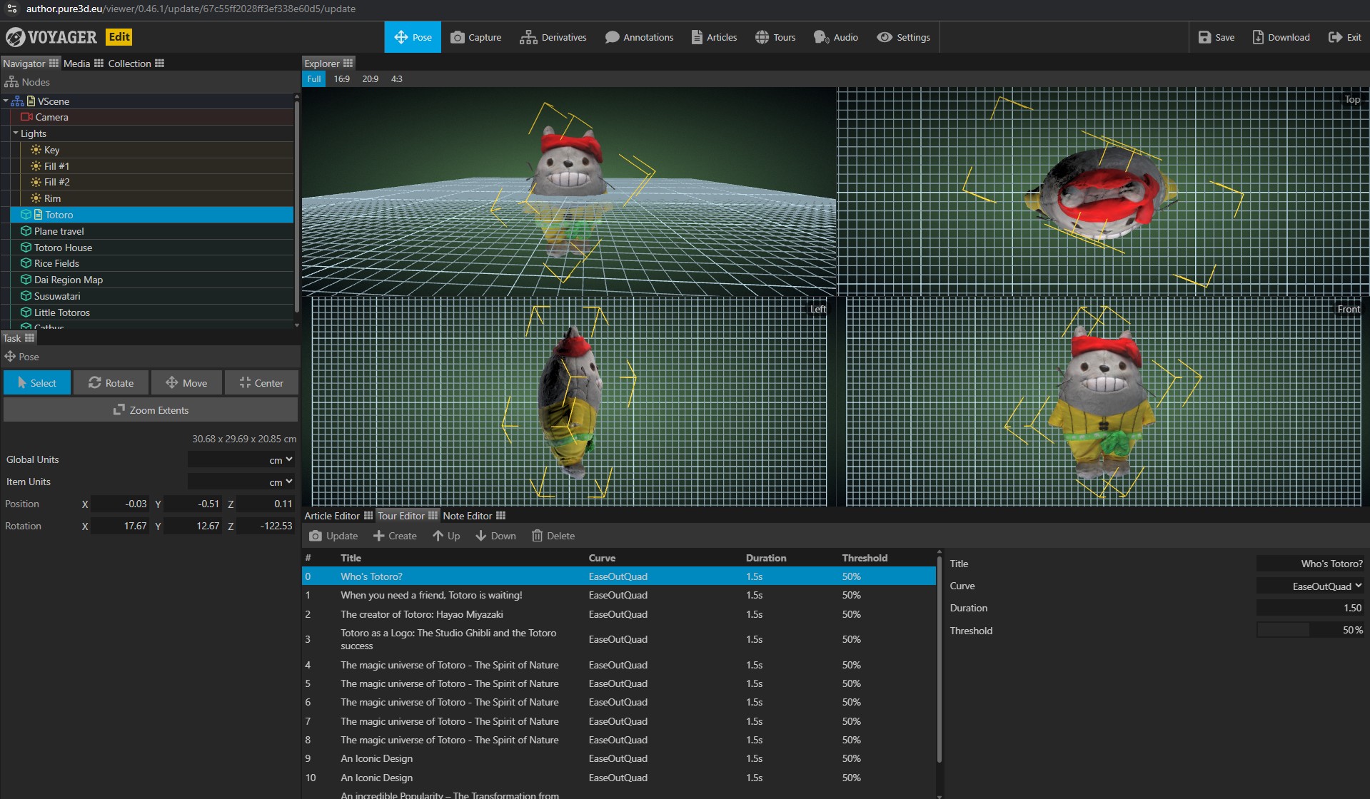 Creating the tours allowed us to combine almost all the functions available on Voyager into a single section. We experimented with Totoro’s positioning in space to offer different perspectives on the model, highlighting specific parts or annotations. Unlike the digitization process, this stage didn’t present unexpected challenges or difficulties, but it certainly required a lot of time and precision to ensure the tours were smooth, intuitive, and well-organized. We also worked to minimize frequent errors caused by small limitations in the layout of the articles.