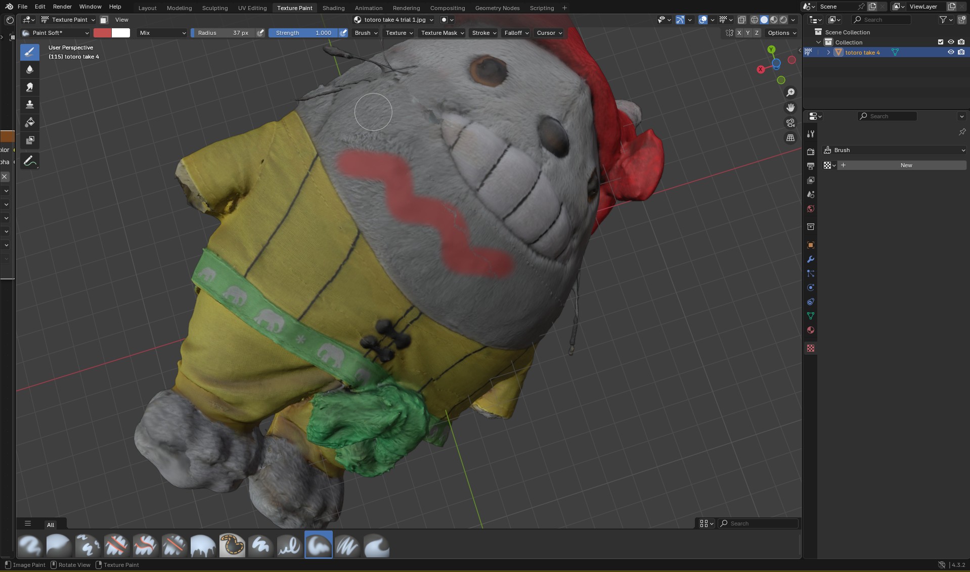 We then explored other options until we decided to import the 3D model into Blender and edit it using this new software. In Blender, we discovered the Texture Paint section, where it’s possible to paint directly onto the 3D model. The program also provides a "clone" brush, which proved incredibly useful for our purpose, as it allowed us to copy and paste sections of the actual texture onto the areas that were incorrectly colored. Using this tool, we manually repainted all the affected parts of Totoro until we achieved the final result.