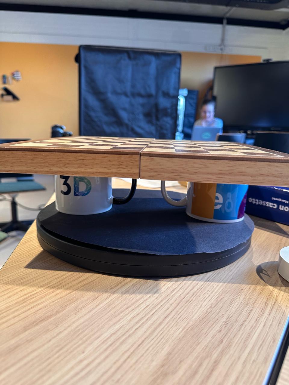 Our initial arrangement was to have the chessboard on a turntable inside a lightbox with a white background. While this arrangement worked well, it caused issues of depth of field—the pieces in the foreground were sharp, but the ones in the background were always fuzzy due to the camera's focus.