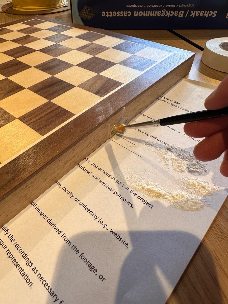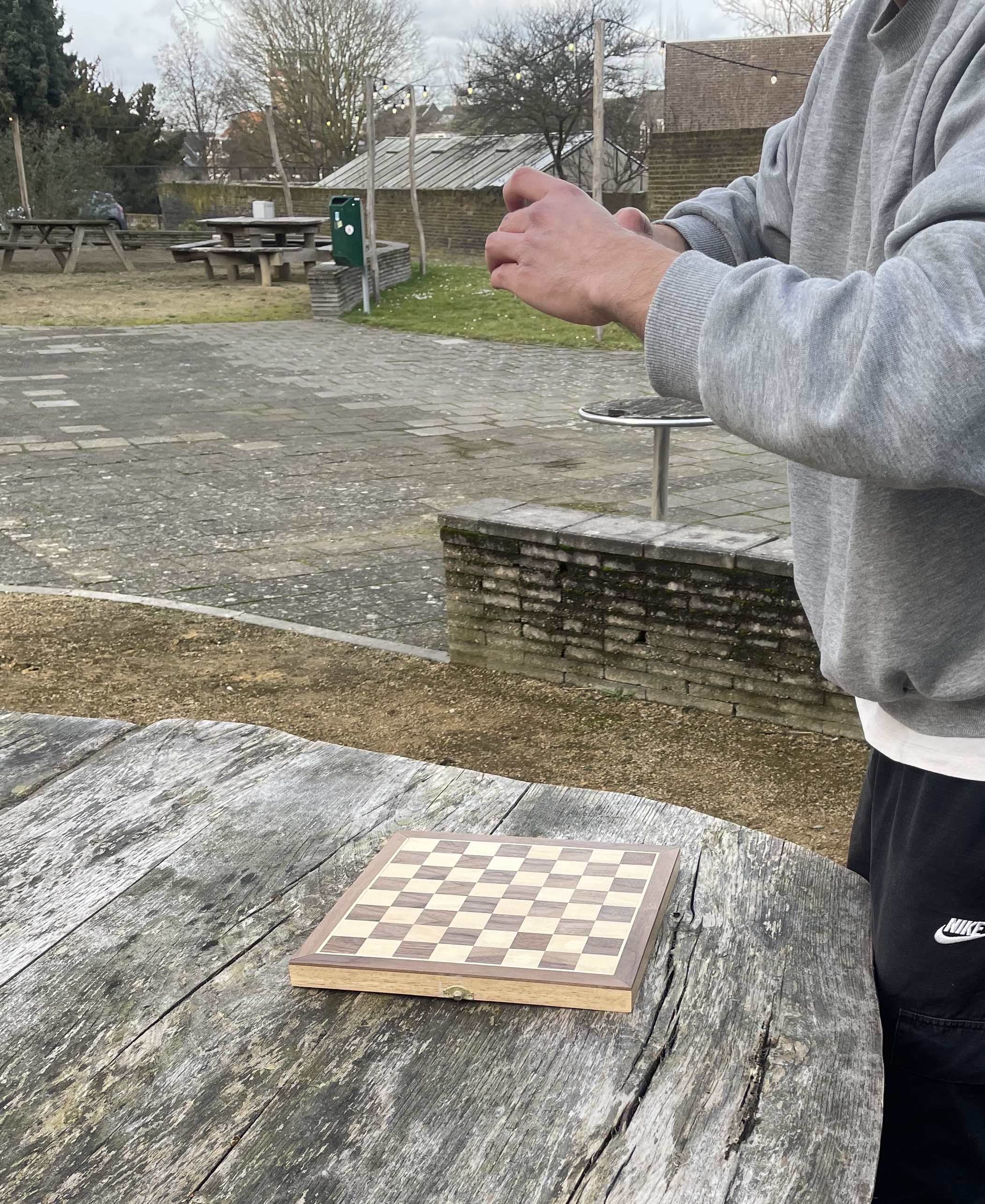 To remedy this, we moved the project outside and put the chessboard on a wooden table in front of natural light. This provided us with greater control over lighting and better overall focus. The pieces were still problematic due to inconsistent focus and glare. We ultimately had to shoot the chessboard and the pieces separately and then composite them together in post-production.