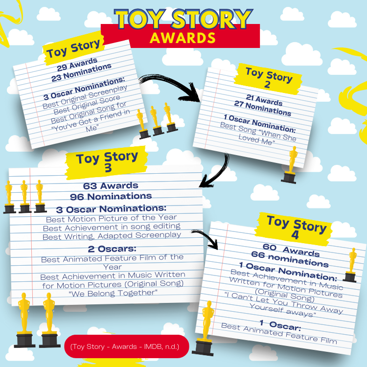 Toy Story’s breakthrough was the American computer-animated movie in 1995. The film won 29 awards including 7 Annie Awards and a Special Achievement Academy Award for John Lasseter. It received 23 nominations including 3 Oscar nominations for Best Original Screenplay, Best Original Score, and Best Original Song for "You've Got a Friend in Me". With almost $350 million in box office receipts and DVD sales, it became the highest-grossing film release in the United States in the year of 1995. (Alcacer et al., 2010). Many consider it one of the best animated films ever made. Toy Story and Toy Story 2 have an incredible 100% rating on Rotten Tomatoes. In 2003, Toy Story was deemed the greatest animated movie of all time by the Online Film Critics Society. Additionally, in 2005, it was selected into the National Film Registry as being one of only five films which entered within its first year of eligibility (Lasseter et al., 2010).