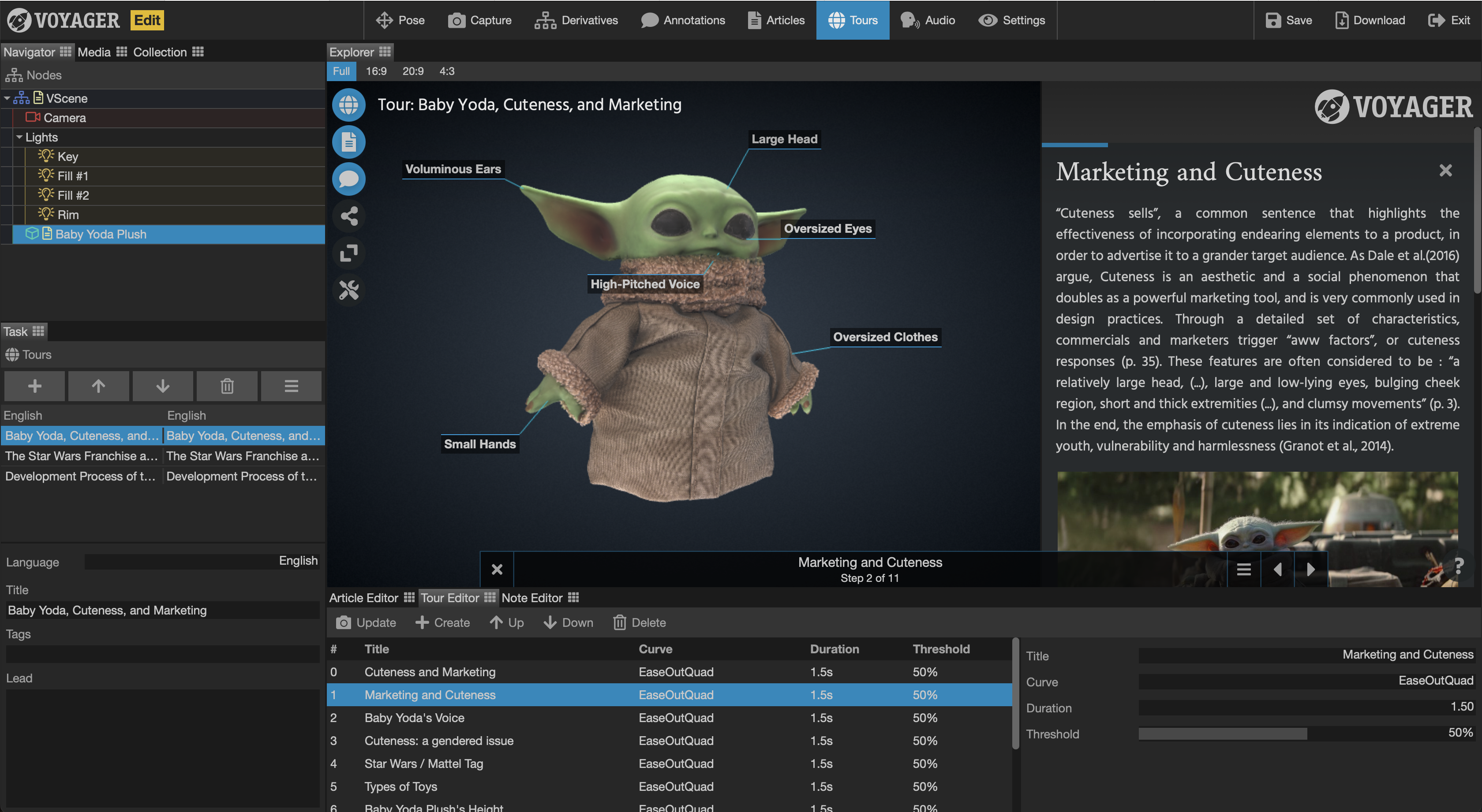 The final part of our process was through the prototype software “Smithsonian Voyager”. The tool is part of the PURE3D project, developed to enable users to create and report research and articles about their 3D model, utilizing a variety of features embedded in the software (Pure3D, n.d.). Among these all the key features are annotations, articles, and tours. These three components of the software are essential to be able to tell a story. Annotations are simple identifiers that are tagged throughout the model, to give context to each part, and may contain different multimodal options. Articles are created to write the research and information on the 3D Model, they can contain images, videos, hyperlinks, and other multimodal pieces, and are much longer than the annotations. While annotations can incorporate links to different articles, Tours are where most information is collected and incorporated together. These tours are a mix of articles, camera movements, and other Voyager features, to offer the audience a unique learning experience (Smishsonian Digitization, n.d.).