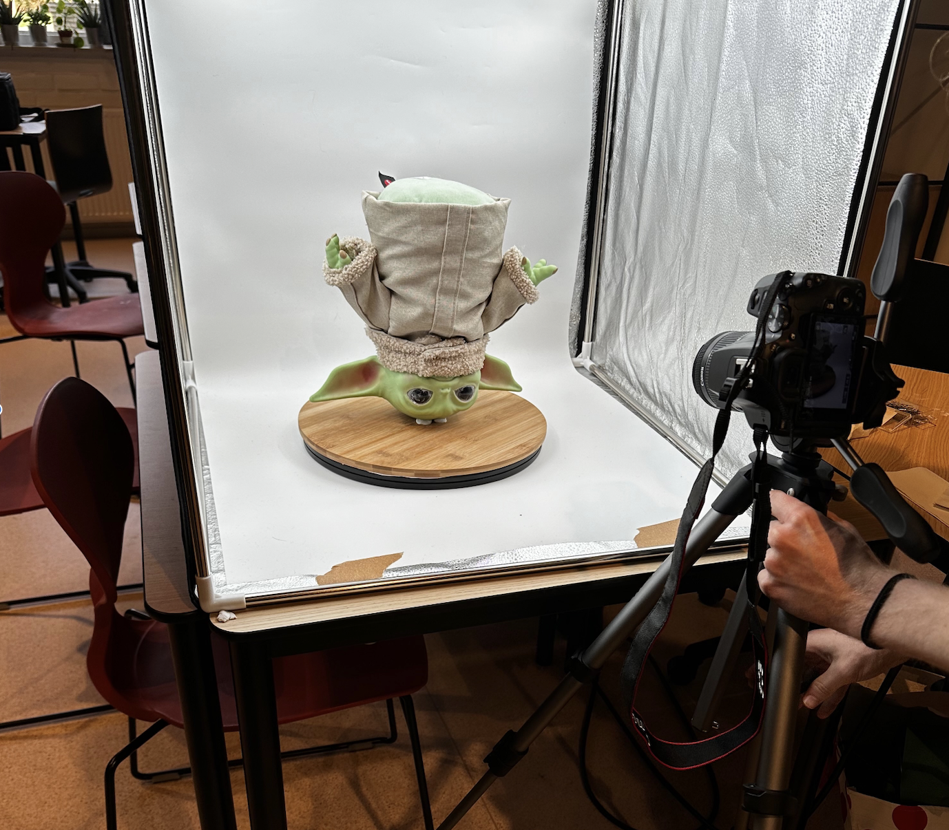 After some deliberation, we decided to come back for another photographing session, in order to capture the bottom of the plush and get a wider perspective on the toy. In order to do so, we put the plush on its hard head, and placed sticky tacks on the bottom so it would stay stable as we turned the plate around. Unfortunately, while uploading the photographs onto the computer, we noticed that the white balance of the two sets of pictures was off. Indeed, while the first set seemed close to reality, the second set had a slight pink hue. Nevertheless, we decided to postpone the color correcting of the second set until after both sets have been merged.