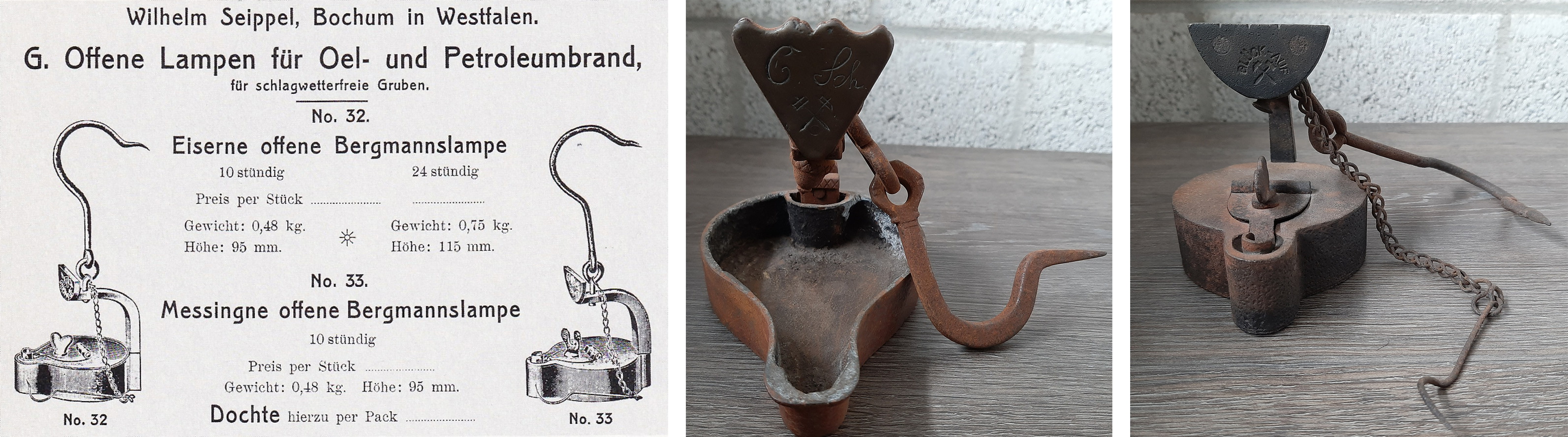 Harz Frosch lamps with a closed reservoir often have a shield attached to the carrying handle, arched at the top. Both the Saxon and Harz Frosch lamps were often decorated with three crosses on the shield, referring to the Holy Trinity (Father, Son, and Holy Spirit) — believed to offer miners protection during their work. Of course, the main purpose remained the same: to provide light.